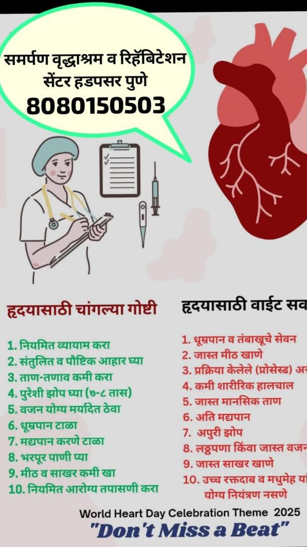 Here's a comprehensive overview of Samarpan Old Age Home and Rehabilitation Center: *About* Samarpan Old Age Home and Rehabilitation Center is a renowned elderly care facility in Pune, India. It provides residential care, rehabilitation services, and medical support to seniors. *Services* 1. Residential Care 2. Rehabilitation Services (Physical, Occupational, Speech Therapy) 3. Medical Care (Doctor on call, Nursing staff, Emergency services) 4. Recreational Activities (Yoga, Meditation, Arts, Crafts) 5. Laundry and Housekeeping 6. Transportation (optional) 7. Spiritual and Cultural Events *Amenities* 1. Air-conditioned Rooms 2. Attached Bathrooms 3. TV and Telephone 4. Library and Reading Room 5. Garden and Outdoor Spaces 6. Physiotherapy Room 7. In-house Kitchen and Dining 8. Security and CCTV Surveillance *Rehabilitation Programs* 1. Stroke Rehabilitation 2. Spinal Cord Injury Rehabilitation 3. Brain Injury Rehabilitation 4. Neurological Disorder Management (Parkinson's, Alzheimer's, etc.) 5. Orthopedic Rehabilitation